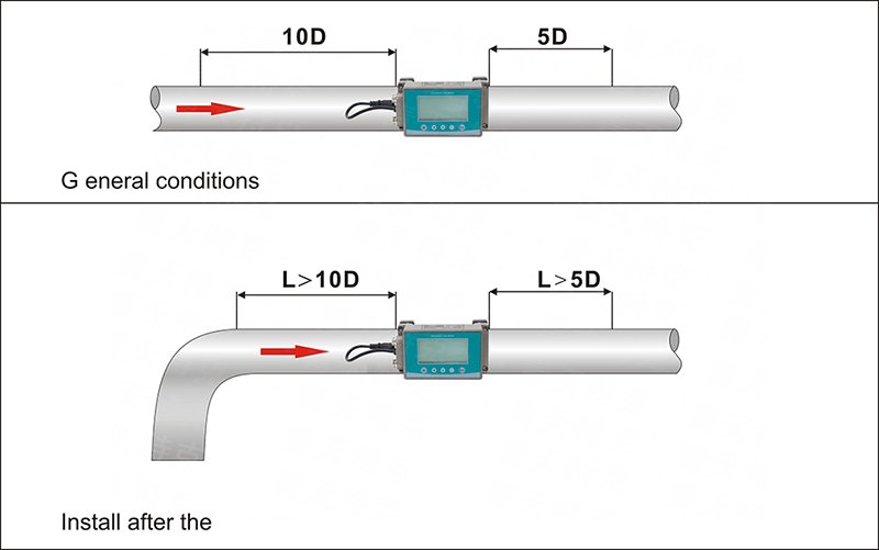 盡量不要擾亂上游流量分布。確保沒有閥門、彎頭或三聯管;嘗試在下游安裝控制裝置或節流閥,以確保足夠測量點的管道流量,詳情如下圖: